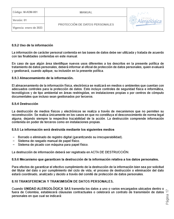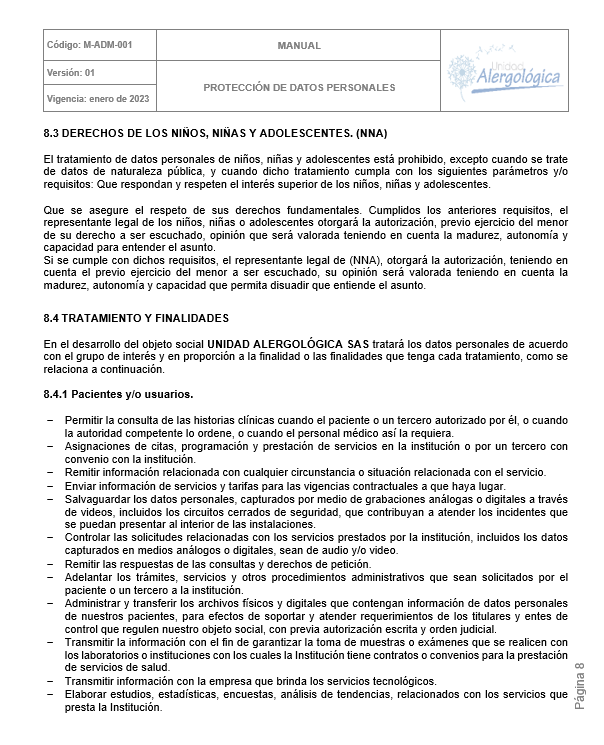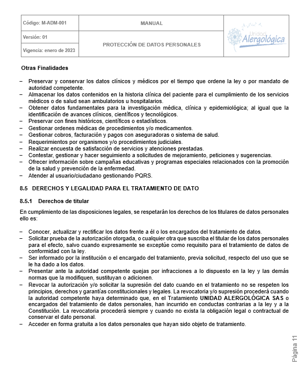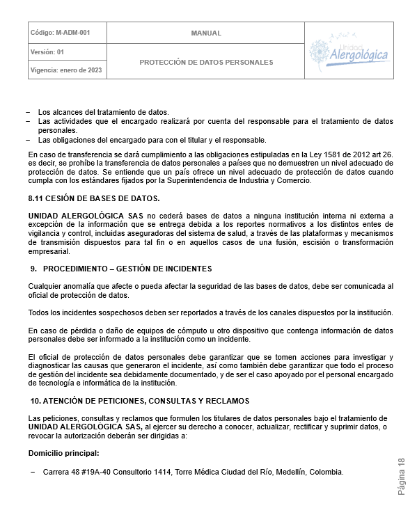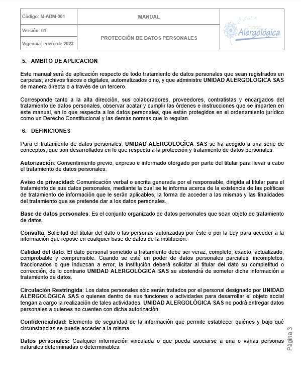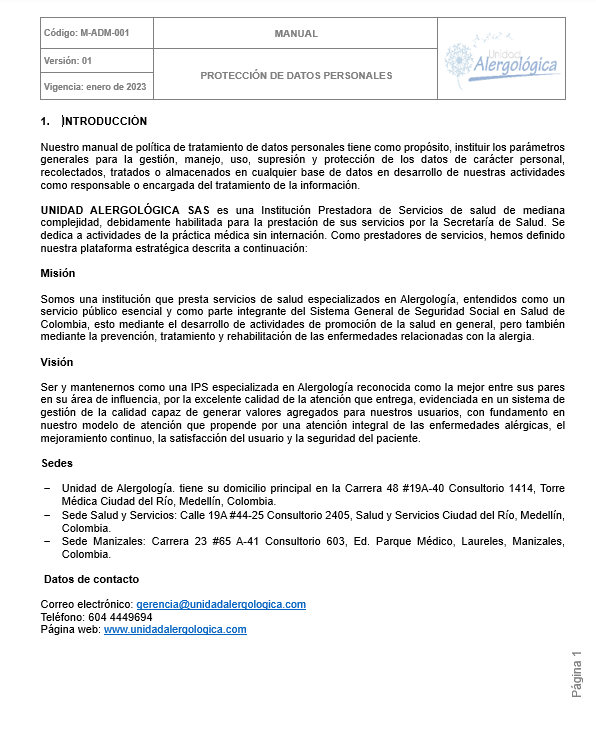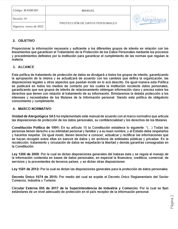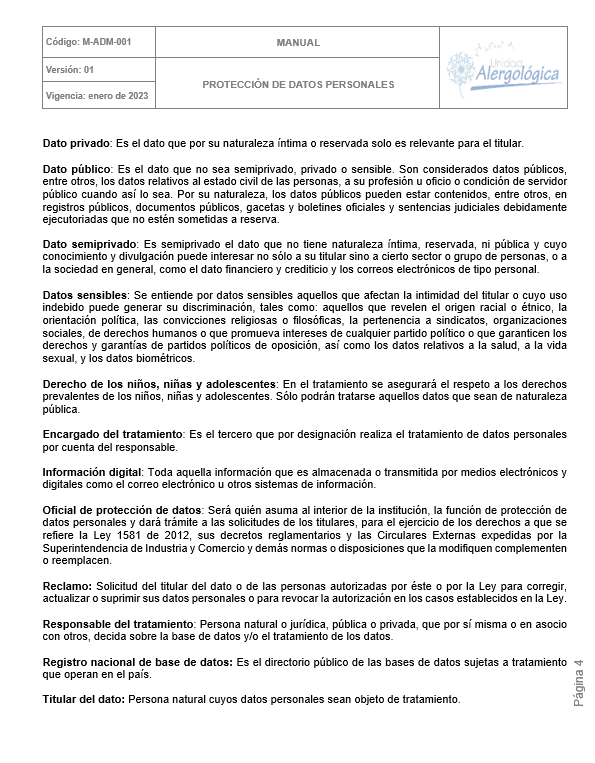 POLÍTICA DE TRATAMIENTO DE DATOS PERSONALES DE UNIDAD ALERGOLÓGICA