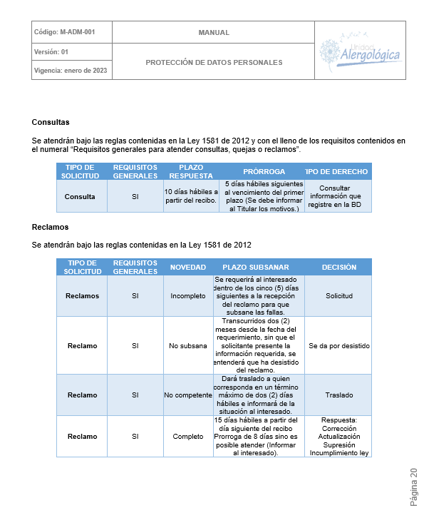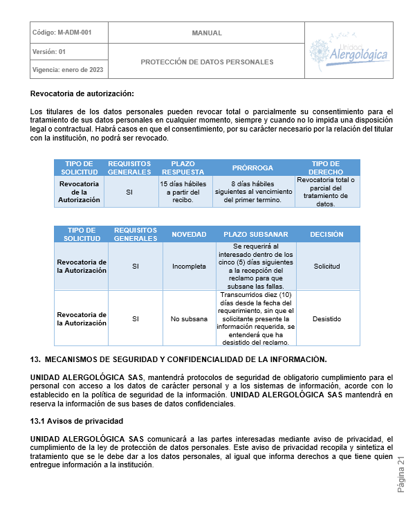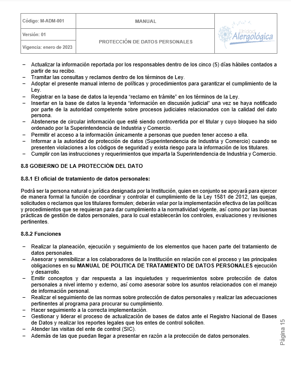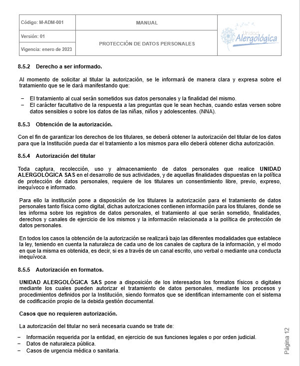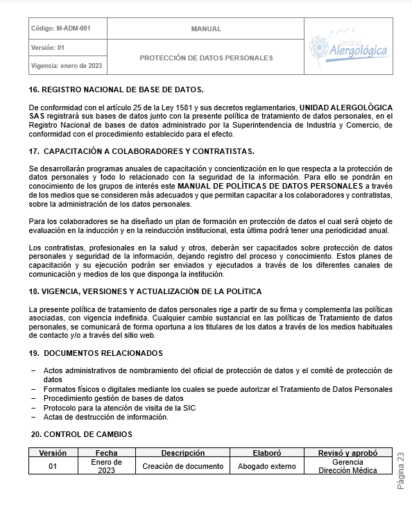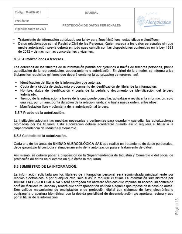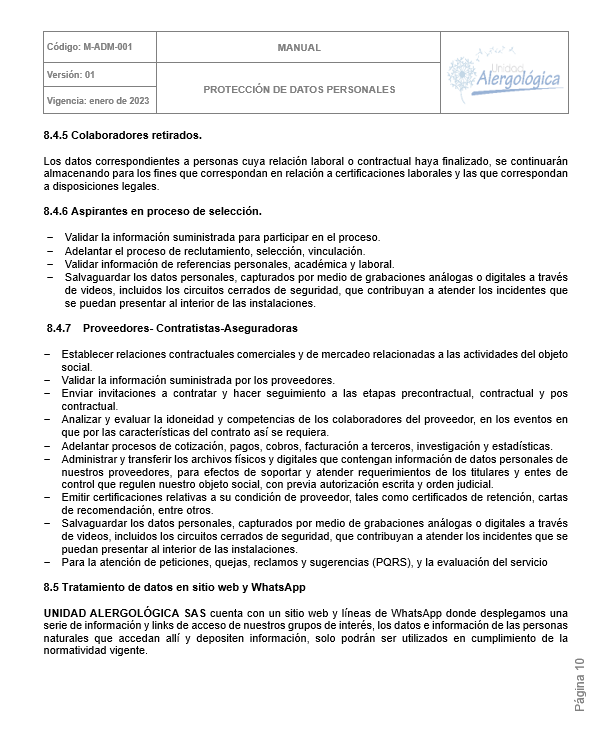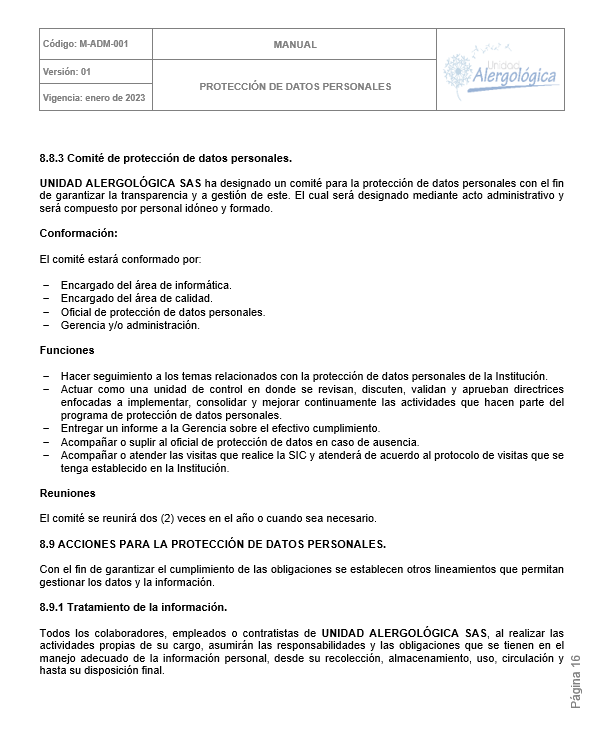 POLÍTICA DE TRATAMIENTO DE DATOS PERSONALES DE UNIDAD ALERGOLÓGICA